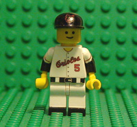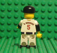 | THIS IS BROOKS ROBINSON IN HIS HOME JERSEY. THIS MINIFIGURE HAS 9 DECALS, FRONT AND BACK TORSO, FRONT AND BACK BELT, BOTH LEGS, BOTH ARMS, AND HAT. HE ALSO HAS BLACK PAINTED HIPS, ARMS, AND SHOES. |