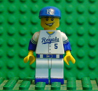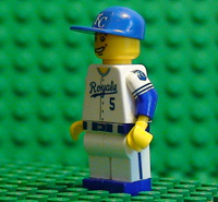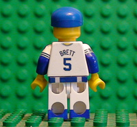 | THIS IS GEORGE BRETT IN HIS HOME JERSEY. THIS MINIFIGURE HAS 9 DECALS, FRONT AND BACK TORSO, FRONT AND BACK BELT, BOTH LEGS, BOTH ARMS, AND HAT. HE ALSO HAS BLUE PAINTED HIPS, ARMS, AND SHOES. |