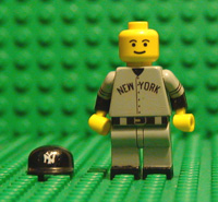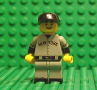 | THIS IS JOE DIMAGGIO IN HIS AWAY JERSEY. THIS MINIFIGURE HAS 7 DECALS, FRONT AND BACK TORSO, FRONT AND BACK BELT, BOTH ARMS, AND HAT. HE ALSO HAS BLACK PAINTED HIPS, ARMS, AND SHOES. |