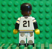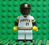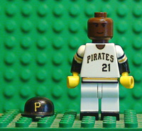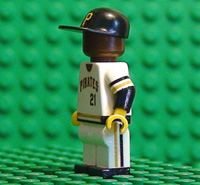 | THIS IS ROBERTO CLEMENTE IN HIS HOME JERSEY. THIS MINIFIGURE HAS 10 DECALS, FRONT AND BACK TORSO, FRONT AND BACK BELT, BOTH LEGS, BOTH ARMS, HAT, AND FACE. HE ALSO HAS BLACK PAINTED HIPS, ARMS, AND SHOES. |